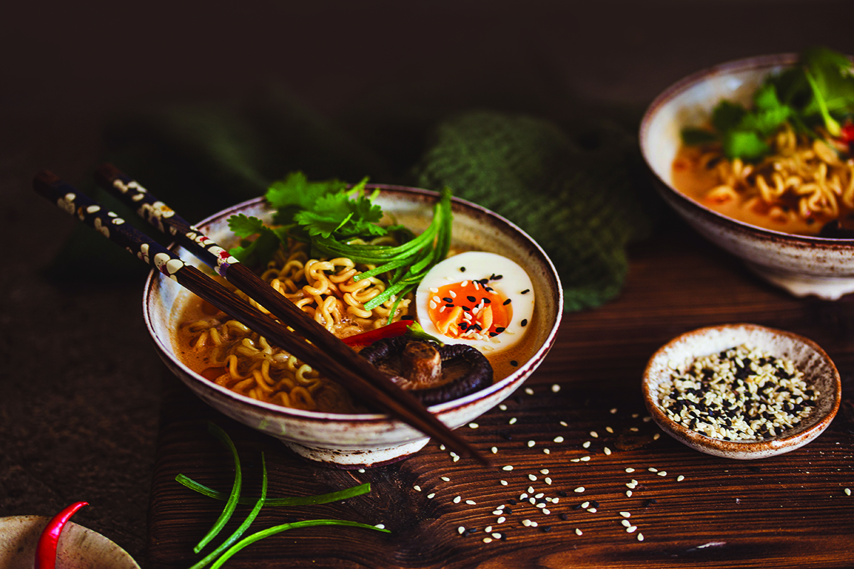 5. Divide cooked noodles among 4 bowls. Pour 14 of broth mixture over each bowl. Garnish each bowl with 14 of the cilantro, 12 of a hard-boiled egg, and a sprinkle of sesame seeds.